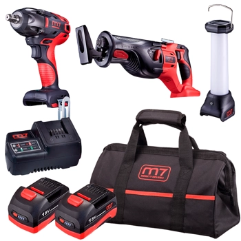 Zestaw narzędzi akumulatorowych M7 Mighty Seven M7PACK2 Klucz udarowy DW-401 + Pilarka DRS-101 + Latarka DFL-101 18V 2x5Ah