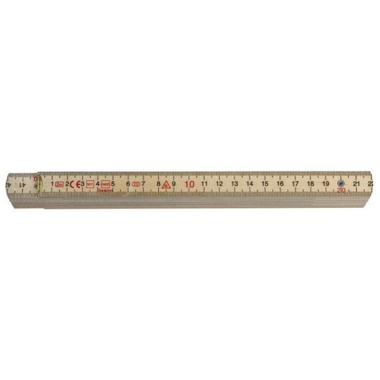 - Wykonana z drewna bukowego. Odcinki o grubości 3 mm zapewniają dodatkową stabilność. Skala metryczna w kolorze czarnym po obu stronach z czerwonymi liczbami dziesiętnymi.
