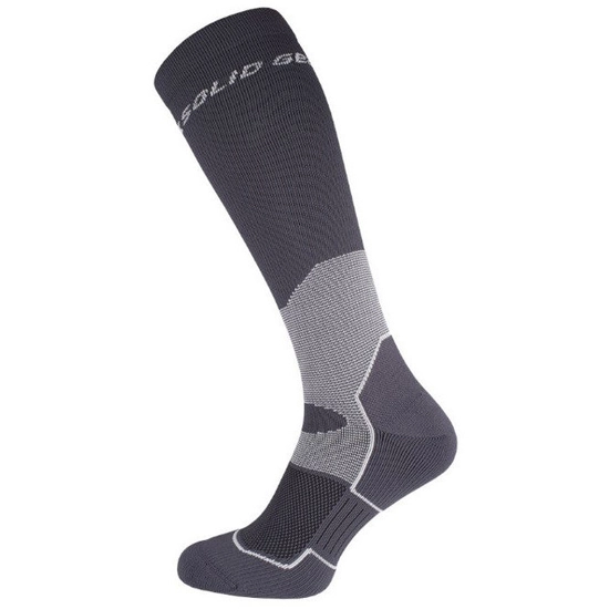 - Wyjątkowy splot i grubszy materiał na palcach, podbiciu i pięcie zapewnia amortyzację. Wygodny ściągacz utrzymuje wkładkę kompresyjną Solid Gear stabilnie poniżej kolana.