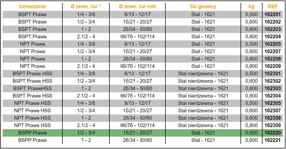 Przeznaczony do wykonywania gwintów „gazowych” o szczelności wg normy NFE 03.004 zgodnej z ISO/7.