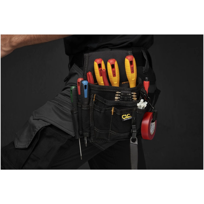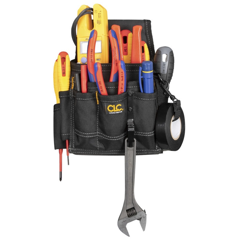 Torba na narzędzia elektryczne i konserwacyjne ma 9 kieszeni do uporządkowania ulubionych narzędzi oraz może być przymocowana do paska za pomocą tradycyjnej pętli lub dostępnego metalowego klipsa.