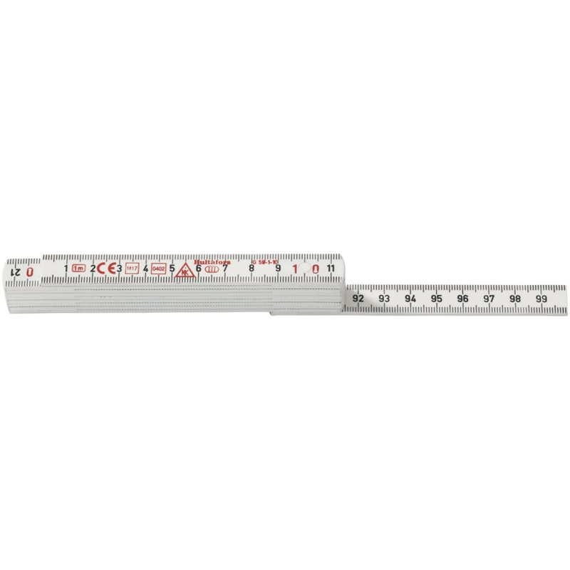 - Miara składana wykonana z poliamidu wzmocnionego włóknem szklanym, zapewniającego zwiększoną odporność na wilgoć. Skala metryczna w kolorze czarnym po obu stronach i czerwone cyfry decymetrowe.