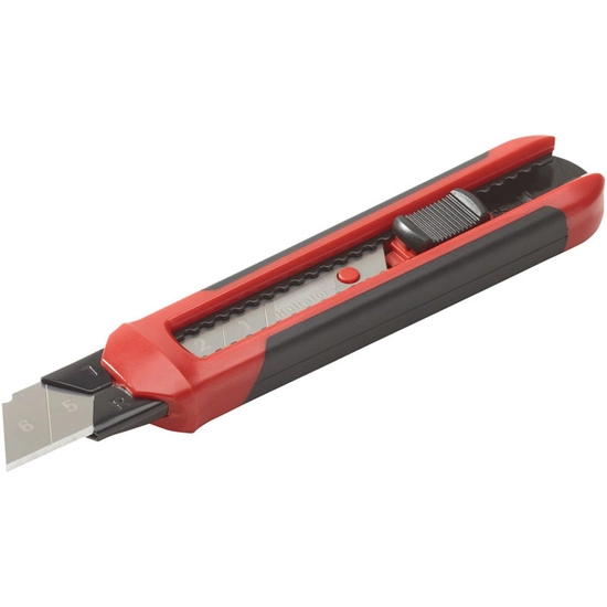 SRP 25A to mocny nóż odłamywany do cięcia grubych dywanów lub izolacji. Konstrukcja z ogumowanym uchwytem sprawia, że nadaje się do materiałów wymagających większej siły nacisku. Zwężany koniec dla lepszej widoczności, dostępu i kontroli. Nóż wykonany z wytrzymałego tworzywa sztucznego PC (poliwęglanu) ze stalowym rdzeniem dla dodatkowej stabilności. W komplecie z 4 ostrzami; 1 w szynie i 3 dodatkowymi w magazynku noża. Metalowa prowadnica o grubości 1 mm dla dodatkowej stabilności.