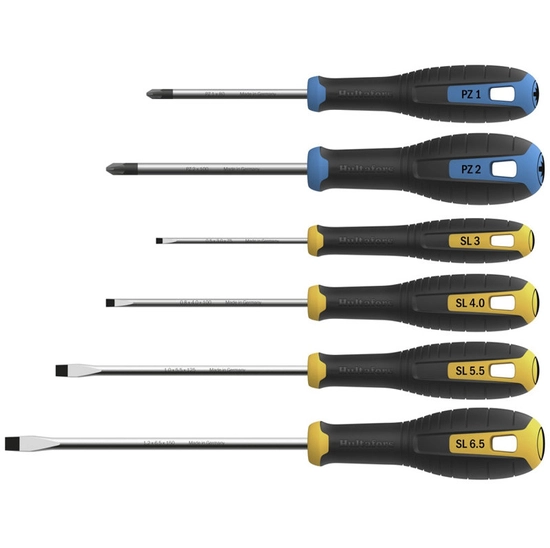 Zestaw 6 szt. śrubokrętów przeznaczonych do użytku profesjonalnego, opracowanych we współpracy z rzemieślnikami. Wszechstronny zestaw do wielu zastosowań. Długie, pokryte gumą rękojeści zapewniają przyczepność, precyzję i maksymalne przenoszenie mocy. Wykonane są z wytrzymałego tworzywa PPC pokrytego odporną na zużycie i łatwą do chwytania gumą. Trwałe oznaczenie typu i rozmiaru na górze rękojeści oraz ich kolory ułatwiają użytkownikowi wybór odpowiedniego wkrętaka. Rękojeści śrubokrętów posiadają otwór do zawieszenia lub zabezpieczenia. Ich kształt zapobiega toczeniu się wkrętaka po pochyłych powierzchniach. Groty wykonane z wysokiej jakości hartowanej stali zapewniającej trwałość.
