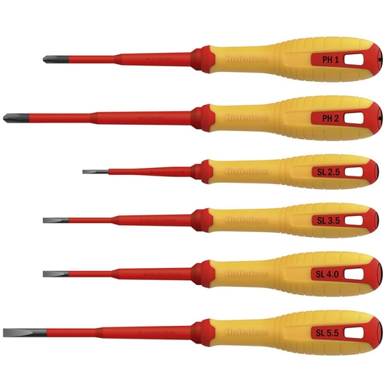 - Zestaw 6 szt. śrubokrętów VDE, przeznaczonych do użytku profesjonalnego, opracowany we współpracy z rzemieślnikami. Zawiera wkrętaki PH 1 i 2 oraz wkrętaki płaskie 2,5, 3,5, 4 i 5,5.
