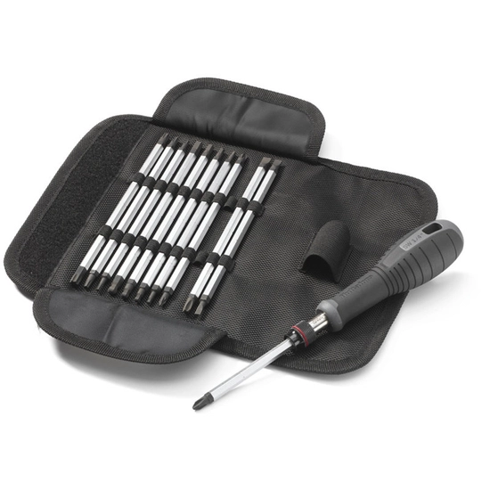 - Zawiera bity płaskie 4, 5,5 i 6,5, PH 1, 2 i 3, PZ 1 i 2, z końcówką kulkową sześciokątną 3, 4, 5 i 6 mm oraz Torx® T10, 15, 20, 25, 30 i 40.