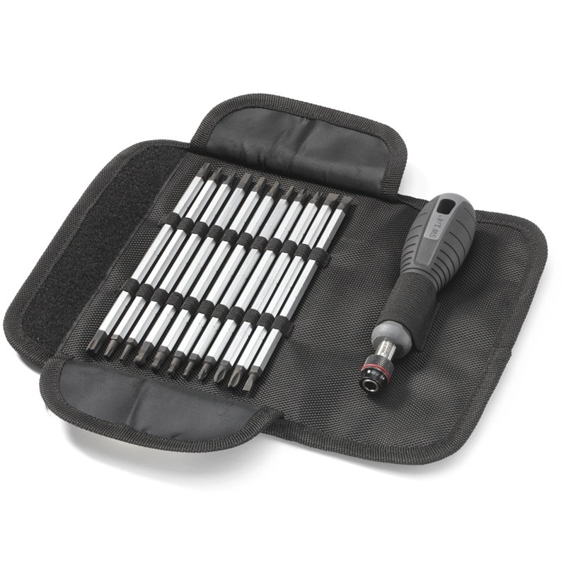 Zestaw długich bitów z uchwytem w praktycznym tekstylnym futerale. Opracowany do użytku profesjonalnego wspólnie z rzemieślnikami. Długość bitów można regulować, wkładając je do uchwytu.