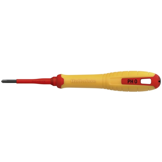 Wkrętak Phillips z izolowanym grotem do prac przy instalacjach elektrycznych do 1000 V. Opracowany do użytku profesjonalnego we współpracy z rzemieślnikami. Każdy śrubokręt jest testowany i certyfikowany zgodnie z normą IEC 60900. Rozmiary PH 1 i 2 mają dodatkowo zwężony grot, zapewniający lepszy dostęp w ograniczonych przestrzeniach. Ergonomiczna konstrukcja zapewniająca optymalny komfort pracy. Długa, pokryta gumą rękojeść zapewnia przyczepność, precyzję i maksymalne przenoszenie mocy. Wykonana jest z wytrzymałego tworzywa PPC pokrytego odporną na zużycie i łatwą do chwytania gumą. Trwałe oznaczenie typu i rozmiaru na górze rękojeści oraz jej kolor ułatwiają użytkownikowi wybór odpowiedniego wkrętaka. Rękojeść śrubokrętu posiada otwór do zawieszenia lub zabezpieczenia. Jej kształt zapobiega toczeniu się wkrętaka po pochyłych powierzchniach. Grot jest wykonany z wysokiej jakości hartowanej stali zapewniającej trwałość.
