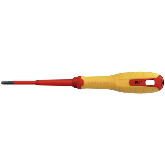 Wkrętak Phillips z izolowanym grotem do prac przy instalacjach elektrycznych do 1000 V. Opracowany do użytku profesjonalnego we współpracy z rzemieślnikami. Każdy śrubokręt jest testowany i certyfikowany zgodnie z normą IEC 60900. Rozmiary PH 1 i 2 mają dodatkowo zwężony grot, zapewniający lepszy dostęp w ograniczonych przestrzeniach. Ergonomiczna konstrukcja zapewniająca optymalny komfort pracy. Długa, pokryta gumą rękojeść zapewnia przyczepność, precyzję i maksymalne przenoszenie mocy. Wykonana jest z wytrzymałego tworzywa PPC pokrytego odporną na zużycie i łatwą do chwytania gumą. Trwałe oznaczenie typu i rozmiaru na górze rękojeści oraz jej kolor ułatwiają użytkownikowi wybór odpowiedniego wkrętaka. Rękojeść śrubokrętu posiada otwór do zawieszenia lub zabezpieczenia. Jej kształt zapobiega toczeniu się wkrętaka po pochyłych powierzchniach. Grot jest wykonany z wysokiej jakości hartowanej stali zapewniającej trwałość.