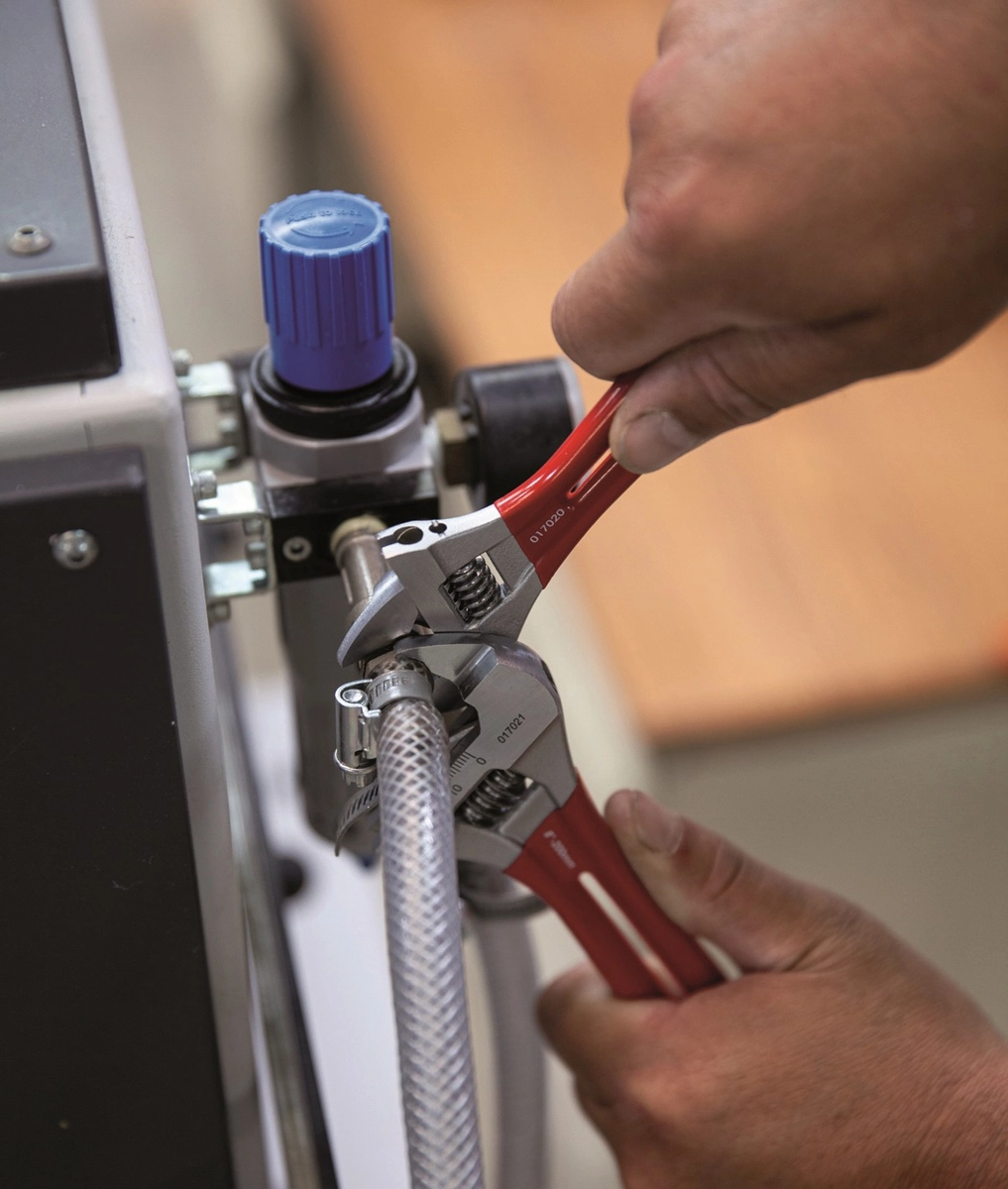 Szczęka o dużym rozwarciu pozwala zastąpić dwa klucze (6"–8" dla nr kat. 017020, 8"–10" dla nr kat. 017021 itp.).