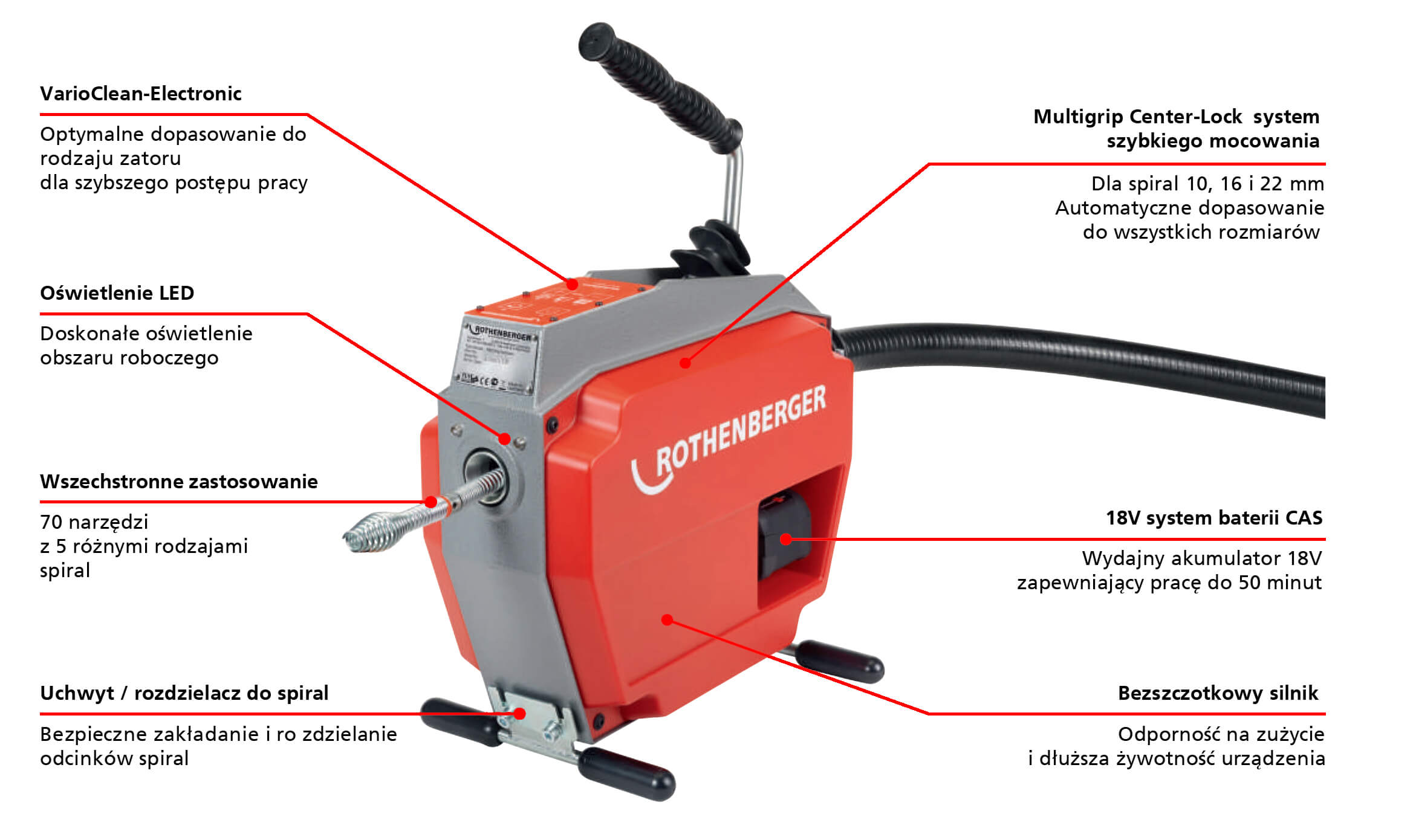 - Max. długość robocza 50 m (ze spiralami 16mm), 60 m (ze spiralami 22mm);