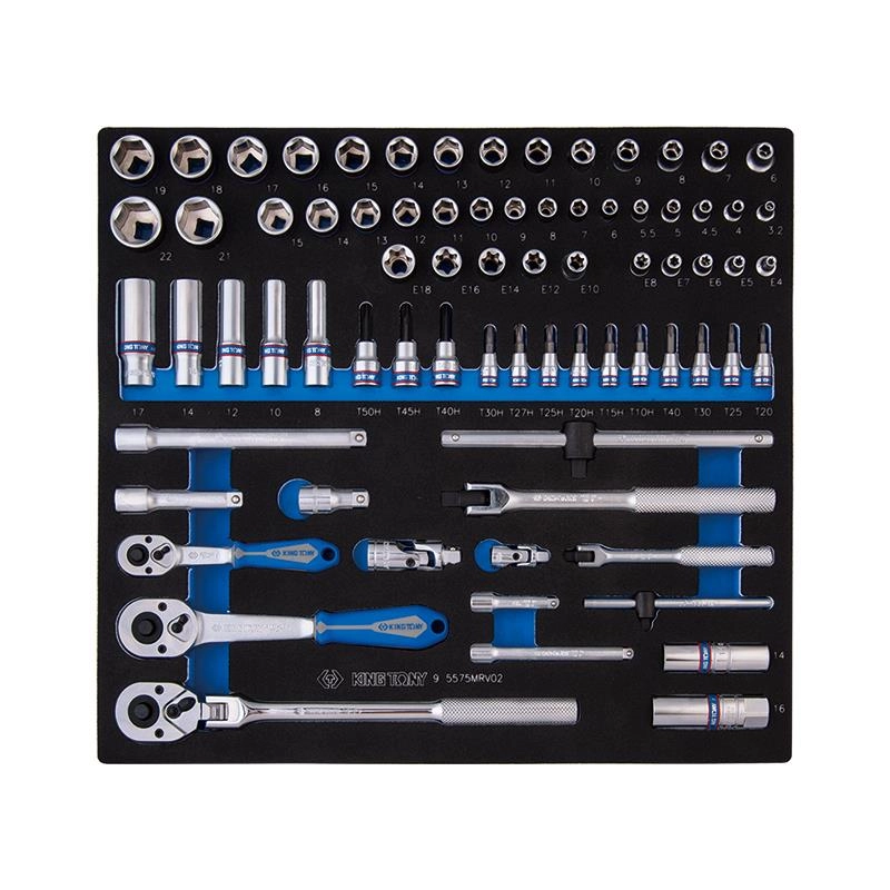 ZESTAW NASADEK 1/4" + 3/8" 75cz. KRÓTKIE/DŁUGIE, 6-kąt. 3.2 - 22mm Z AKCESORIAMI, WKŁAD Z PIANKI EVA DO WÓZKA 9-5575MRV02 King Tony