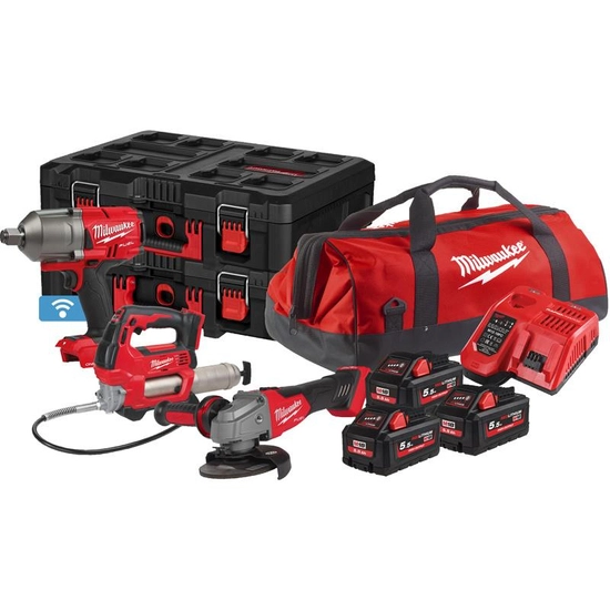 Zestaw narzędzi akumulatorowych PowerPack Milwaukee M18 FPP3M-553P Klucz udarowy M18 ONEFHIWF34 + Smarownica M18 GG + Szlifierka M18 FSAG125X 18V 3x5.5Ah 4933479534