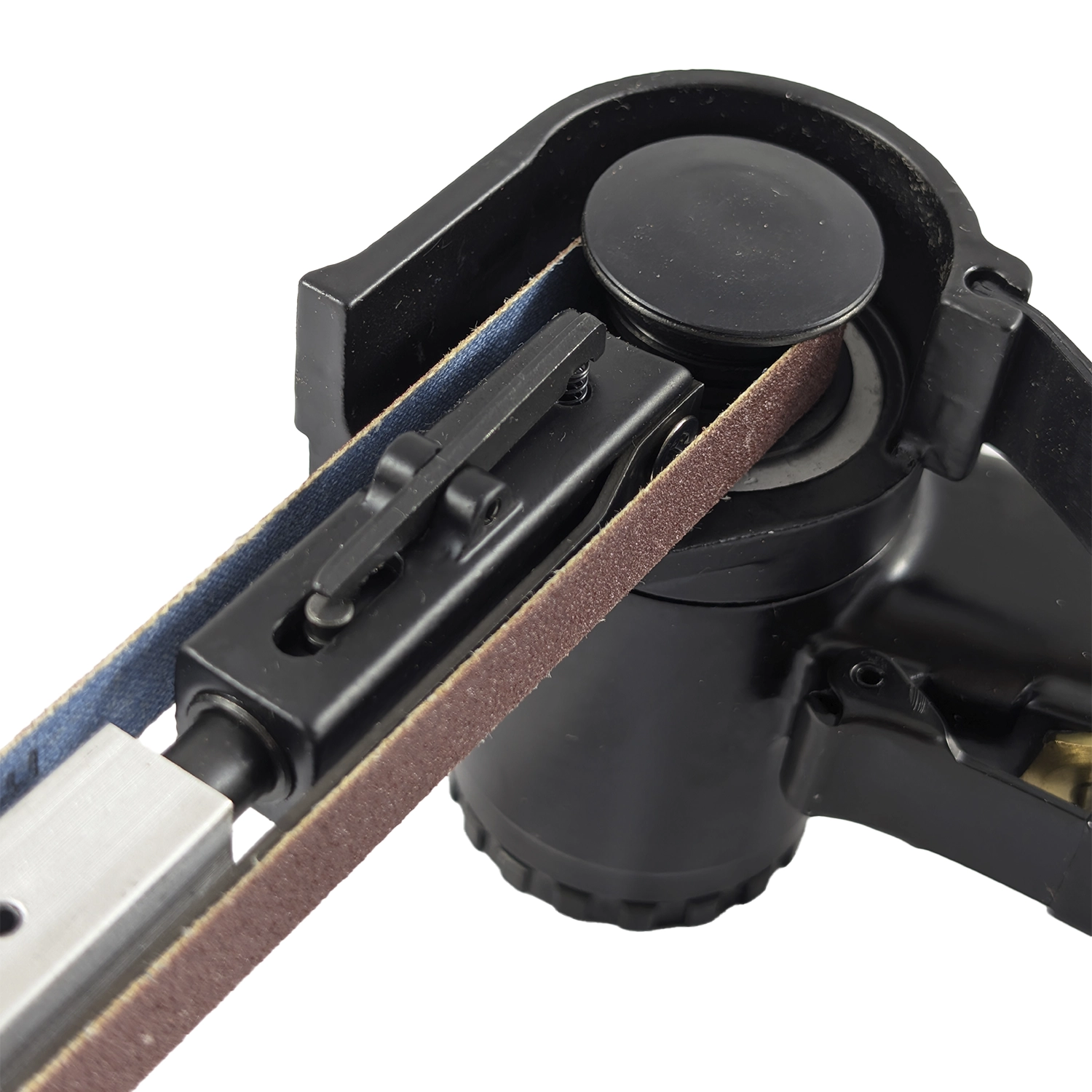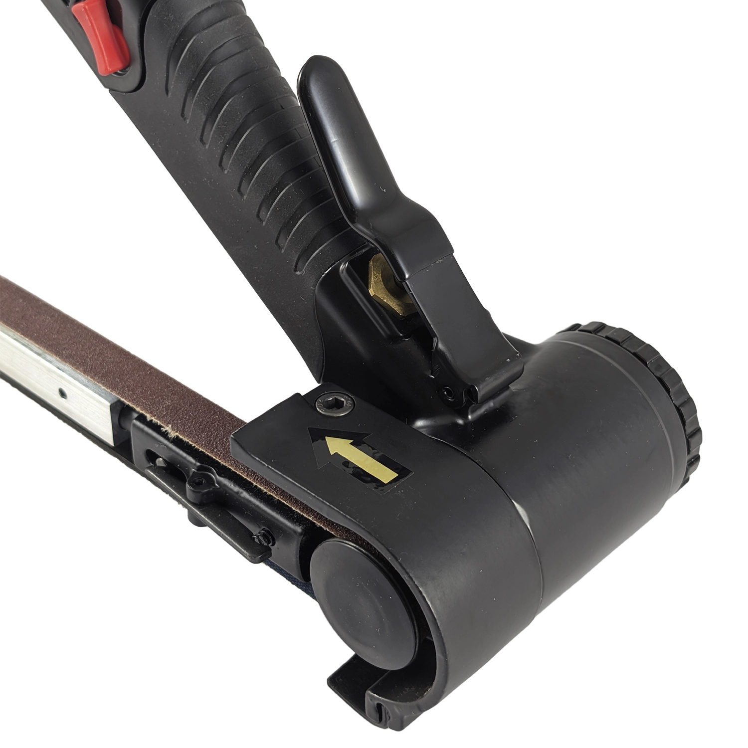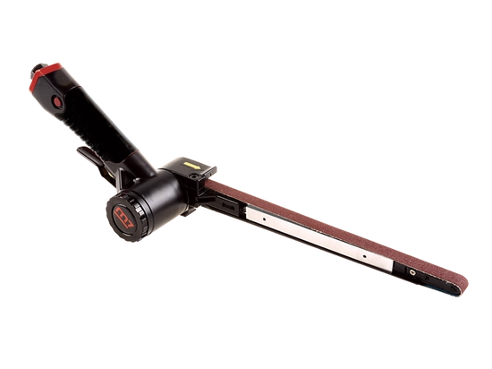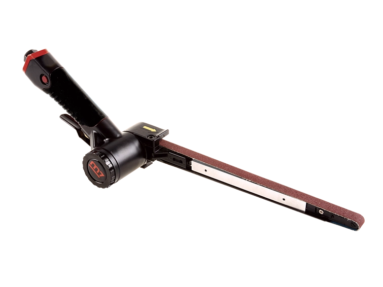 Urządzenie wyposażono w w pełni regulowaną głowicę roboczą względem rękojeści, co pozwala na komfortowe i skuteczne wykorzystanie narzędzia nawet w trudno dostępnych miejscach. Profilowana rolka prowadząca zapewnia stabilne ułożenie taśmy ściernej podczas obróbki, umożliwiając precyzyjne i równomierne wygładzanie powierzchni. Co więcej, długi zasięg rolki prowadzącej pozwala na pracę w zamkniętych profilach o małych przekrojach oraz w miejscach, gdzie standardowe szlifierki taśmowe nie mogą dotrzeć.