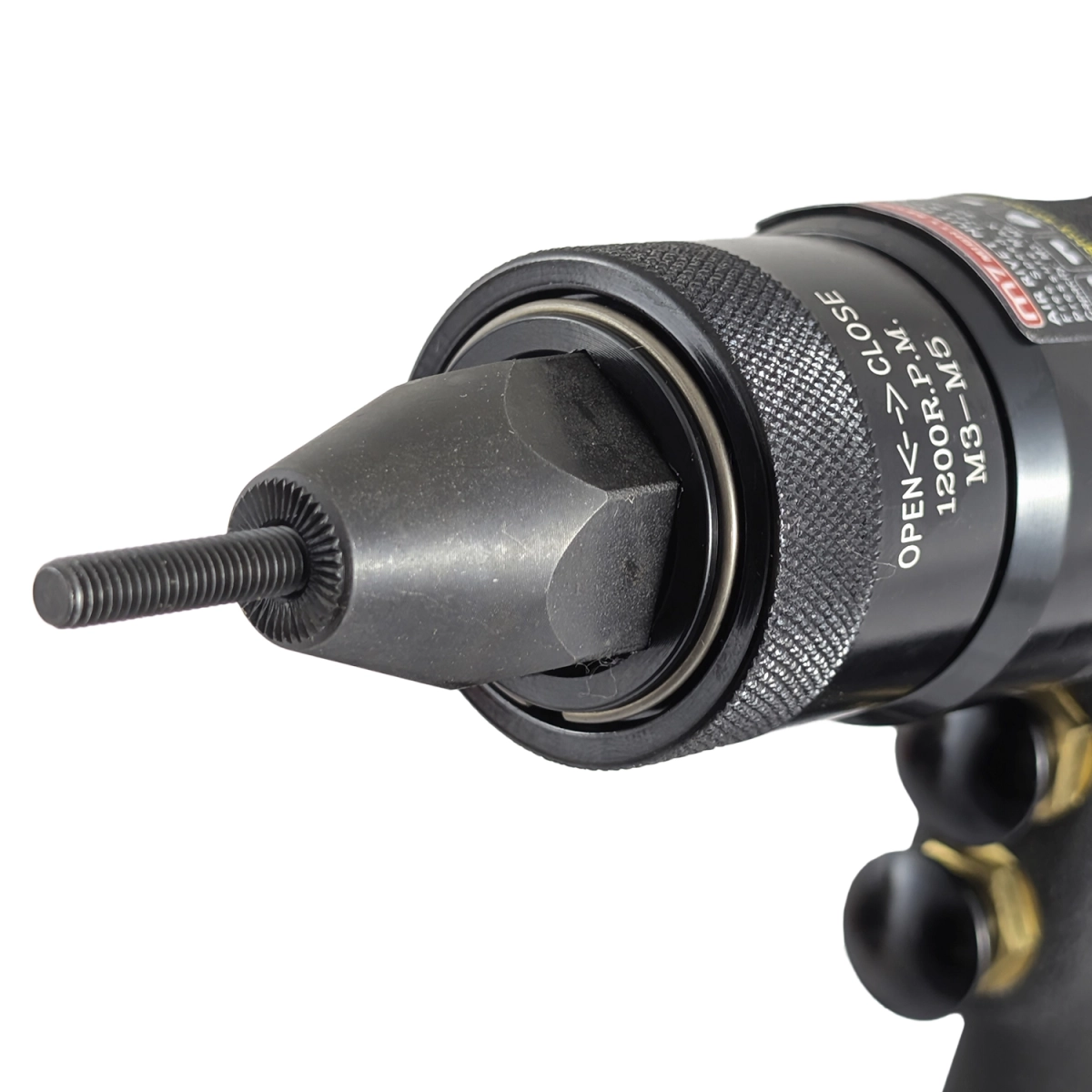 Urządzenie zostało wyposażone w innowacyjny system sterowania trzpieniem roboczym. Dwa niezależne przyciski umożliwiają szybką zmianę kierunku obrotów, co znacznie ułatwia osadzanie nitonakrętki na trzpieniu i jej wycofanie po zakończeniu procesu zaciskania. Taka konstrukcja minimalizuje czas potrzebny na wykonanie każdej operacji, zwiększając tym samym wydajność pracy.