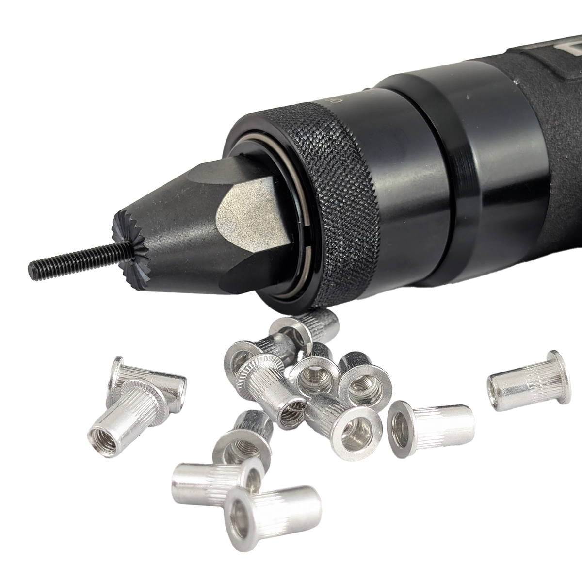 Urządzenie oferuje dużą elastyczność dzięki dwóm szybko wymiennym głowicom roboczym, które obsługują nitonakrętki w rozmiarach M6 i M8. Mechanizm szybkiego zwalniania umożliwia łatwą i szybką wymianę trzpienia, co pozwala na dostosowanie narzędzia do specyficznych wymagań projektu bez konieczności posiadania kilku różnych urządzeń.