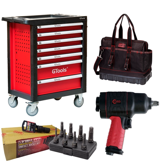 WÓZEK NARZĘDZIOWY GTOOLS GT-001 PNEUMATYCZNY KLUCZ UDAROWY CORD CR-1590 - DO 1590NM MOMENTU + 2 ZESTAWY NASADEK M7 - RAZEM 23 SZT NASADEK 1/2" + ADAPTER 1/2" 1/4" DO KLUCZY ZAKRĘTAREK UDAROWYCH TORBA M7 DO PRZECHOWYWANIA