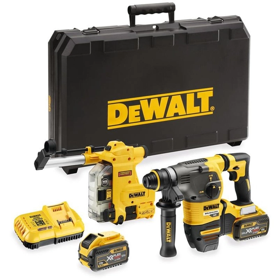 - DCH333X2 (54V XR FLEXVOLT 3-funkcyjna młotowiertarka SDS-Plus z silnikiem bezszczotkowym i uchwytem szybkomocującym, 30mm, 3.5J, 0-1000 obr/min, 0-4480 ud/min, 2 akum. XR FLEXVOLT 9.0 Ah, ładowarka wielonapięciowa) + D25304DH (System odsysania pyłu SDS-P
