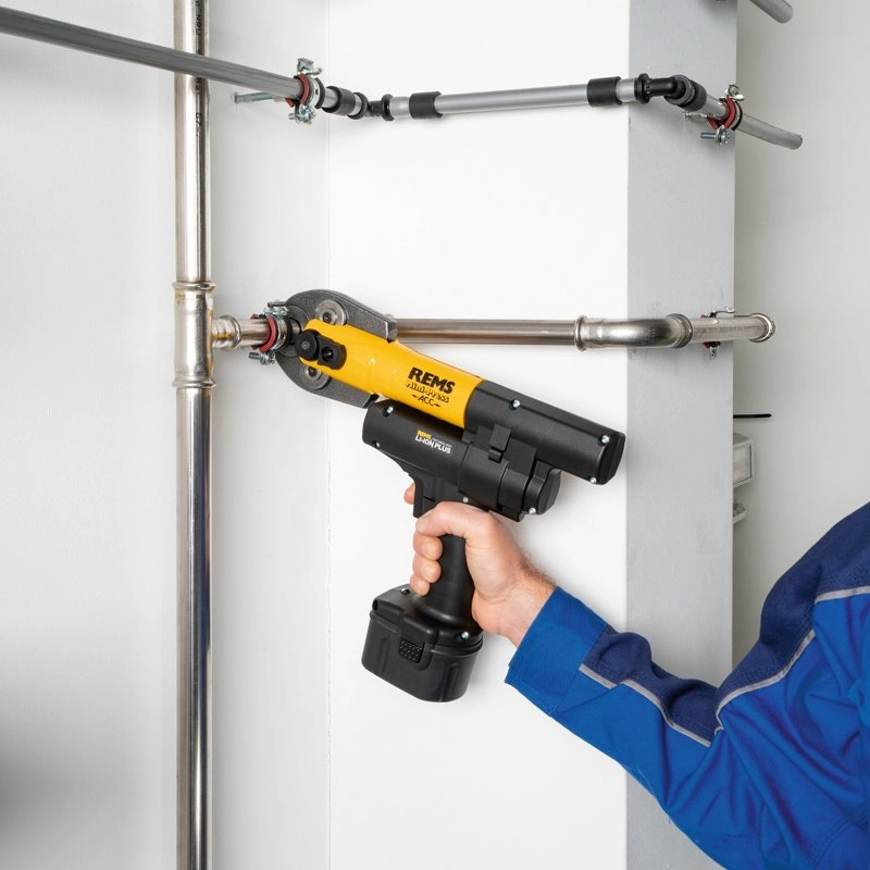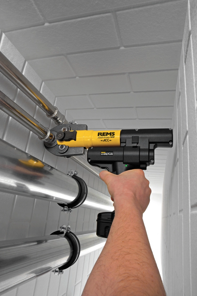 REMS Mini-Press 14V ACC – uniwersalna do Ø 40 mm. Super lekka, mała, poręczna. Błyskawiczne, pewne zaciskanie. Z wymuszonym powrotem. Automatyczne ryglowanie cęgów zaciskowych.