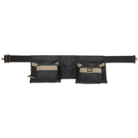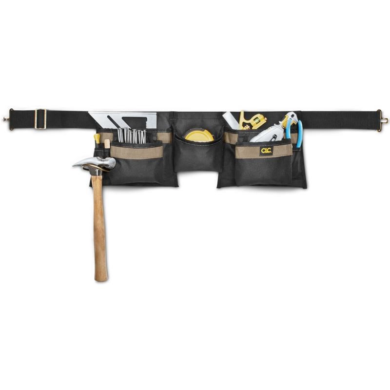 - Pas narzędziowy o szerokości 50 mm z zapinaną klamrą, 5 głównymi kieszeniami, 3 mniejszymi kieszeniami, posiadający stalową szlufkę na młotek.