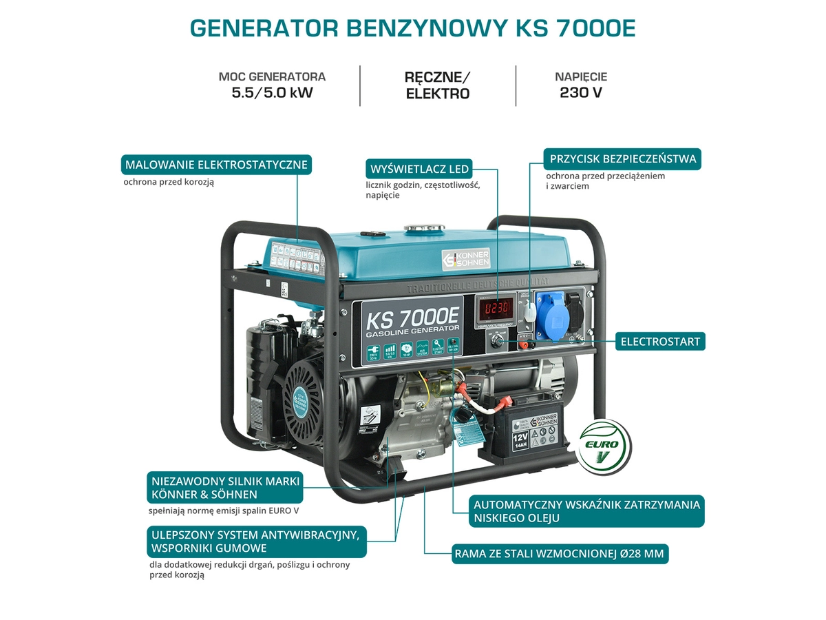 Wszystkie modele generatorów «Könner & Söhnen» są wyposa-żone w podwójny system antywibracyjny, który redukuje hałas i wydłuża żywotność generatora. Silniki są zamocowane na wyso-kiej jakości gumowych poduszkach. Wzmocniona stalowa rama ma dodatkowe gumowe wsporniki, które zmniejszają odporność na wibracje i korozję