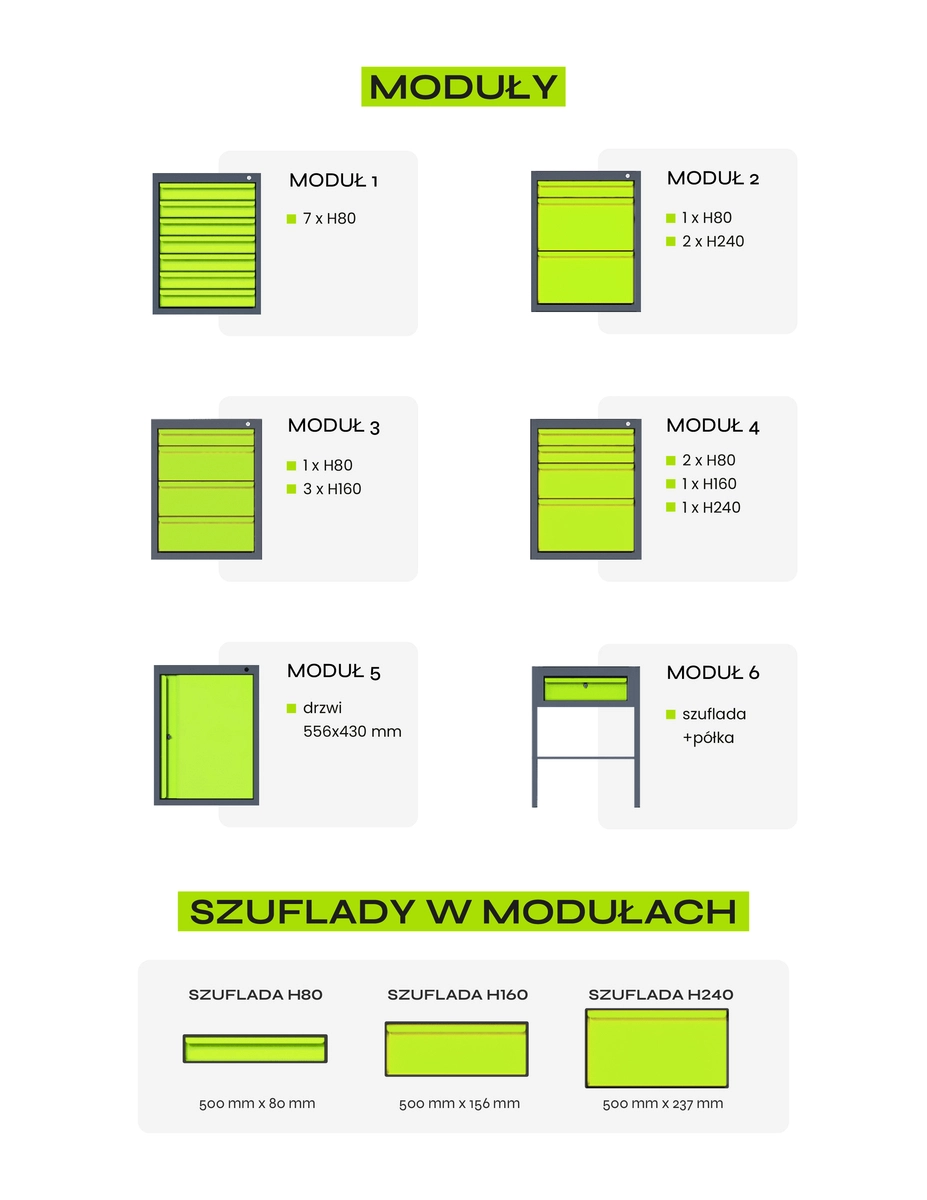 - Możliwość manipulacji układem oraz wielkością szuflad poprzez zmianę modułów