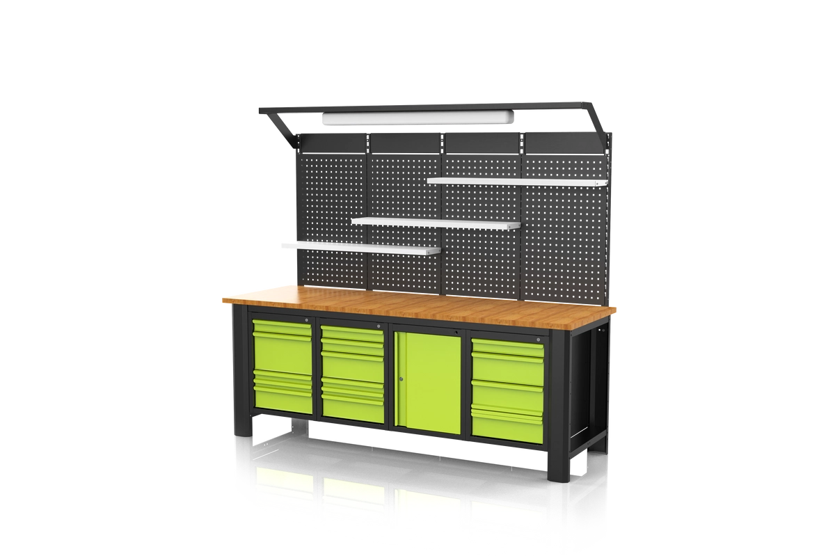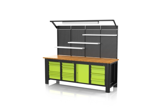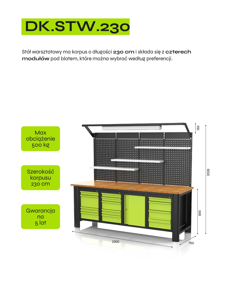 Ścianka perforowana i moduł z oświetleniem, które mogą zostać zamontowane ponad korpusem stołu zapewniają ergonomię i wygodę pracy, a Twoja inicjatywa w stosunku do kolorystyki frontów i korpusu nada unikatowy design.