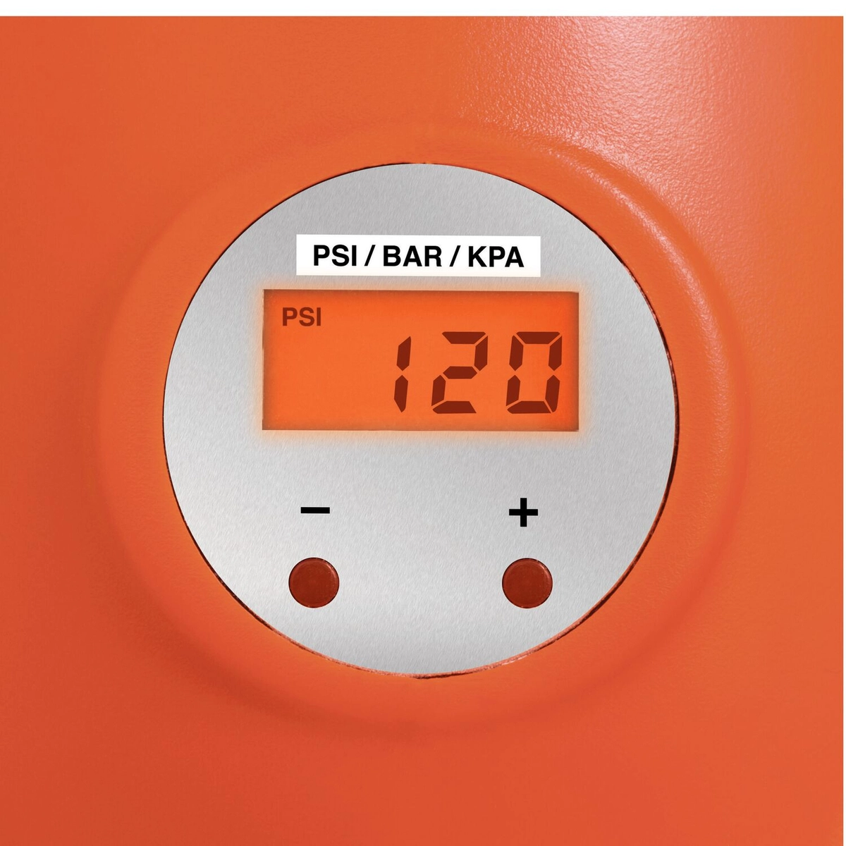 - Prosty w obsłudze selektor wyboru i funkcja automatycznego wyłączenia urządzenia pozwalają na dokładne ustawienie wybranej wartości ciśnienia w bar/psi bez ryzyka nadmiernego napompowania lub niedopomowania