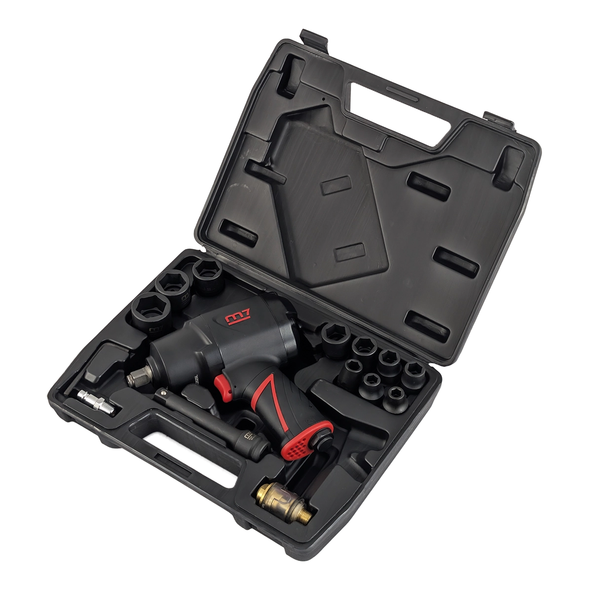 W zestawie oprócz klucza znajduje się 10 nasadek udarowych krótkich MA411 w rozmiarach: M9, M10, M11, M13, M14, M17, M19, M22, M24, M27, przedłużka udarowa 5", mini smarowniczka oraz walizka transportowa.