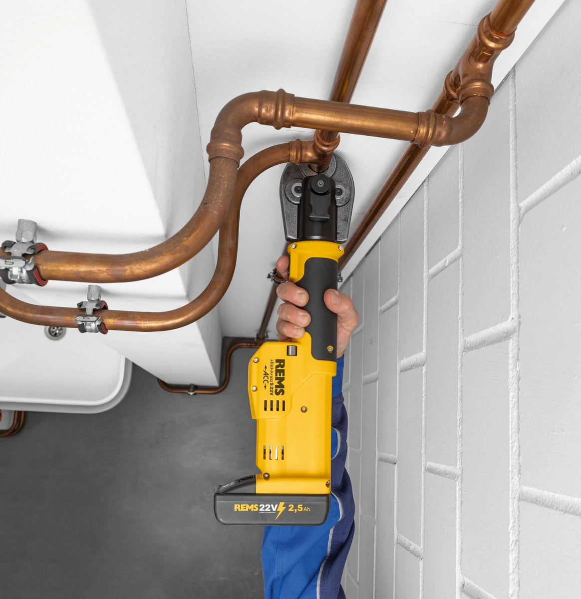 | REMS Mini-Press S 22V ACC – uniwersalna do Ø 40 mm. Super lekka, super mała, super poręczna, niezwykle szybka. Zaciskanie poniżej 4s. Z wymuszonym powrotem. Automatyczne ryglowanie cęgów zaciskowych. Akumulator Li-Ion 21,6V, 2,5Ah wystarcza na ok. 390 zaciśnięć Viega Profipress DN 15 na jedno ładowanie akumulatora | ![]() |