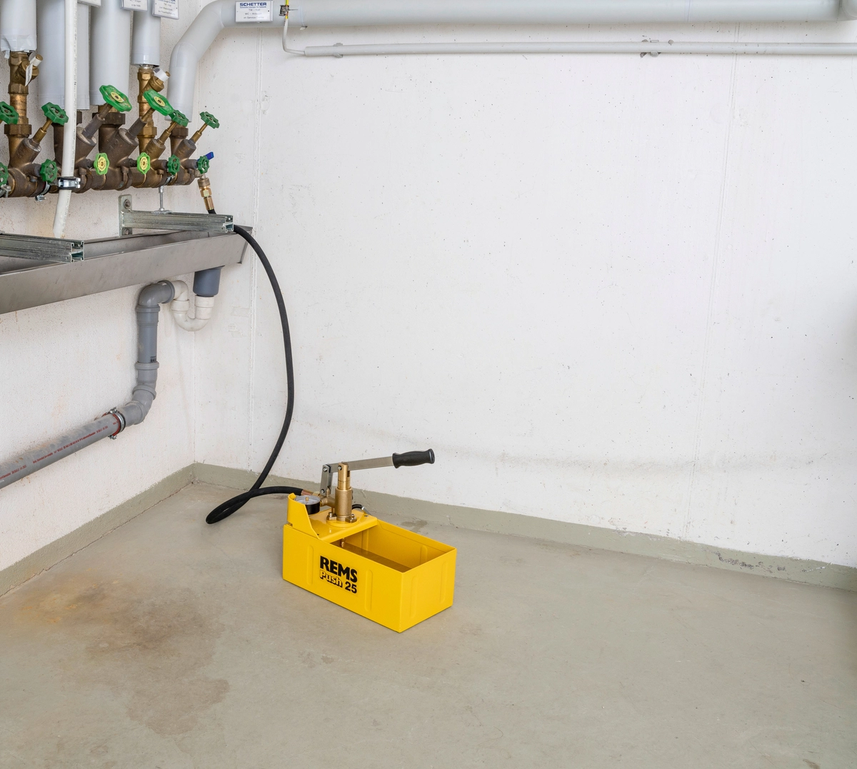 Mocne, sprawdzające się na budowie wykonanie z metalu wytrzymujące duże obciążenia. REMS Push 25 z odpornym na korozję, malowany proszkowo pojemnikiem z blachy stalowej o pojemności 9l. Odporna na skręcanie dźwignia z ergonomicznym uchwytem, przestawiana jako uchwyt do noszenia. Odporny na ścieranie tłok z mosiądzu Ø 30 mm. Manometr ze wskazówką ciągnioną do łatwego wykrywania spadków ciśnienia podczas prób ciśnieniowych i szczelności. Wskazówka ciągniona zatrzymuje przy najwyższej osiągniętej wartości ciśnienia, aż do jej ręcznego wyzerowania. Wąż ciśnieniowy z ½"-przyłączeniem. Płyta rozdzielcza ze stabilną osłoną manometru. Precyzyjnie wyskalowany manometr, p ≤ 1,6 MPa/16 bar/232 psi, do odczytu zmian ciśnienia w zakresie 0,01 MPa/0,1 bar/1,45 psi przy sprawdzaniu na szczelność zgodnie z DIN 1988, jako osprzęt.