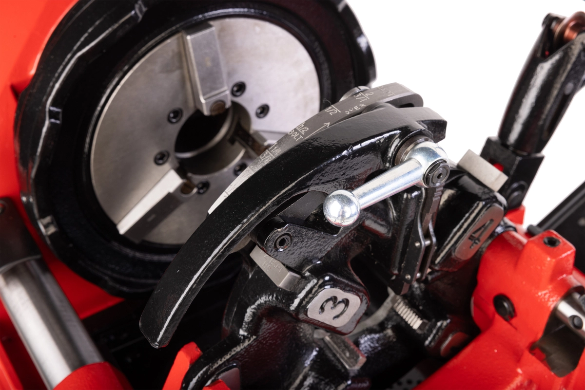 Gwinciarka do rur 2 '' GTronic, dzięki uchwytowi zaciskowemu z wymiennymi wkładkami szczęk oraz tylnej mechanice centrującej z zaciskiem mimośrodowym, umożliwia dokładne i stabilne mocowanie rury co przekłada się na stabilność podczas gwintowania. Automatyczna głowica gwinciarska do gwintów BSPT w zakresie od 1/2” do 2” zapewnia wszechstronność zastosowań.