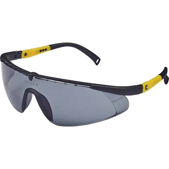 Okulary z szybkami poliwęglanowymi, regulowany kąt nachylenia i długość ramion, sportowy wygląd, szybki nieparujące i odporne na zarysowania, klasa F według normy EN 166 - ochrona przed odpryskami ciał stałych o niskiej energii uderzenia, klasa optyczna 1, żółte szybki z filtrem UV według normy EN 170, przyciemnione szybki z ochronnym przeciwsłonecznym filtrem według normy EN 172.