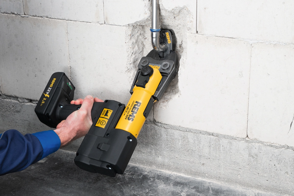 REMS Akku-Press 22V ACC – uniwersalna do Ø 10 – 108 mm (plastik), 10-54 mm (Stal, miedź). Błyskawiczne, pewne zaciskanie. Z automatycznym powrotem, kontrolą siły zacisku i wskazaniem wyniku. System antywibracyjny. Automatyczne ryglowanie cęgów zaciskowych. Akumulator Li-Ion 22V, 2,5Ah