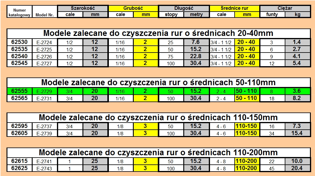 - Rozmiary i długości do stosowania w liniach kanalizacyjnych i odpływowych: do 8" (200 mm) średnicy oraz 100' (30,4 m) długości.