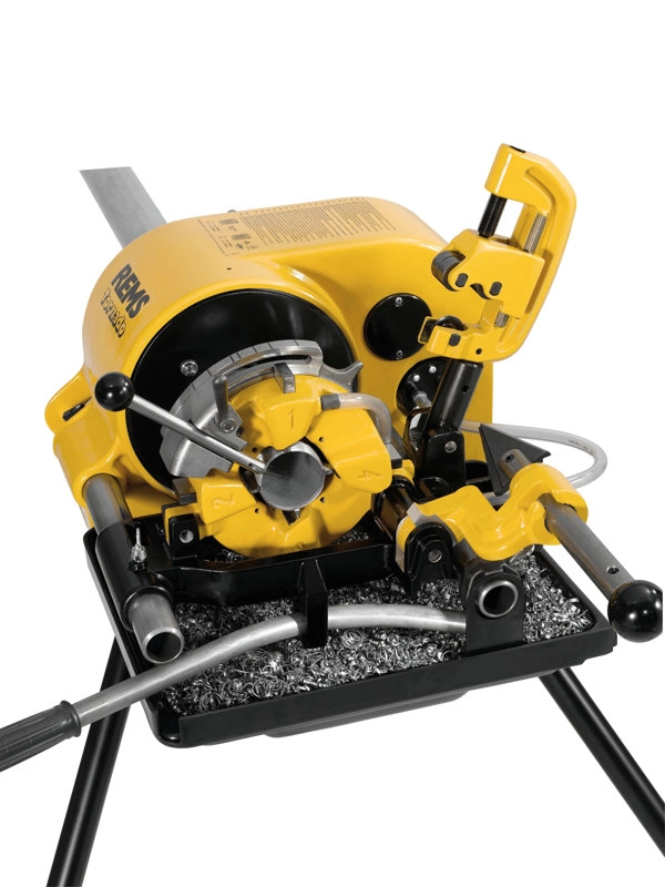 REMS Tornado. Maszyna do gwintowania. Gwinty rurowe (1/16) ⅛ – 2", 16 – 63 mm, gwinty sworzniowe (6) 10 – 60 mm, ¼ – 2". Bezobsługowa przekładnia, nożny wyłącznik bezpieczeństwa z wył. awaryjnym, dwa automatyczne uchwyty zacisko- we, automatyczne smarowanie i chłodzenie. Z zestawem narzędzi, w skład którego wchodzi jedna automatycznie otwierająca się głowica uniwersalna do wszystkich gwintów, również długich, z automatyką długości gwintu dla gwintów stożkowych, noże do stożkowych gwintów rurowych ISO 7-1, EN 10226 (DIN 2999, BSPT) R ½ – ¾ i R 1 – 2 prawe, obcinak do rur, urządzenie do grato- wania wewnętrznego, dźwignia dociskowa, regulowana podpora do materiału. Wykonanie przenośne na 3 nogach z odpinaną, dużą wanną olejową i miską na wióry.