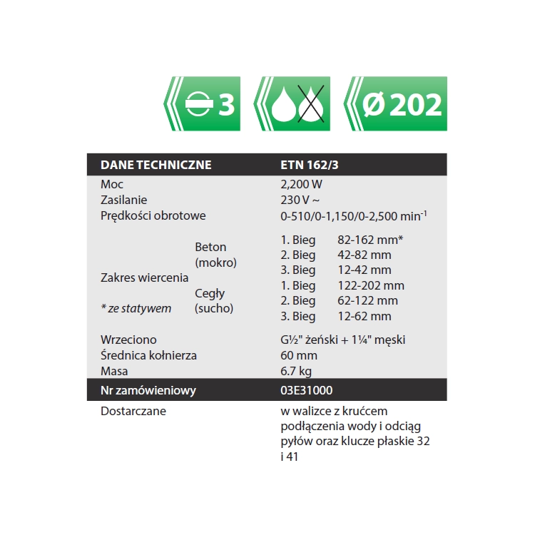 Model DBE 162 to jedna z najlepiej ocenianych wiertnic w klasie do 200 mm. Jest to idealne rozwiązanie dla hydraulików, elektryków i firm ogólnobudowlanych, które potrzebują uniwersalnego narzędzia do wykonywania przepustów rur, kabli oraz otworów wentylacyjnych. Oferowany zestaw zawiera nie tylko silnik napędowy, ale również dedykowany statyw, co gwarantuje stabilność i precyzję od pierwszego użycia.