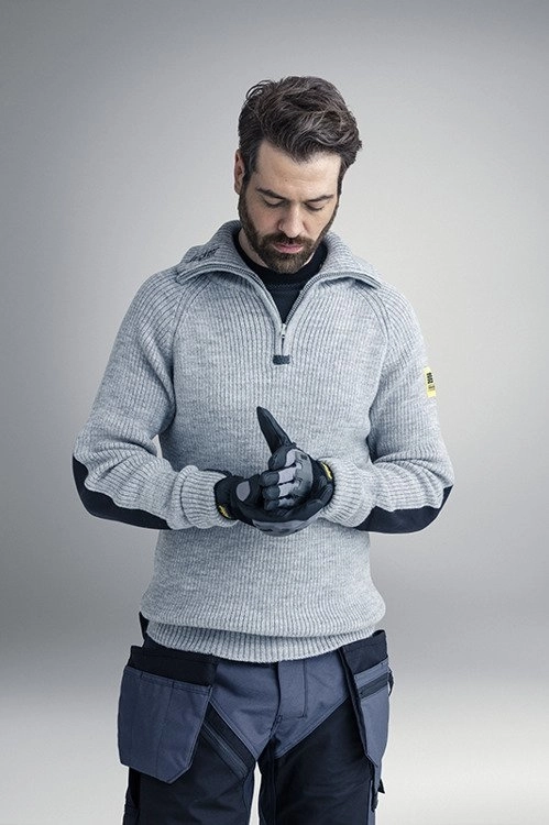 - Wełniany sweter z krótkim zamkiem i wzmocnieniami na rękawach. Skutecznie pochłania wilgoć i oddycha, dając komfort właściwy czystej, naturalnej wełnie.